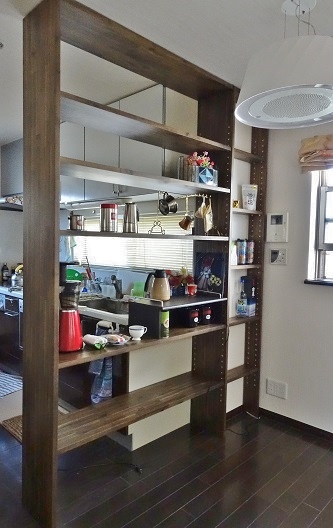 キッチンとの仕切りに、オープンシェルフを集成材で作りました。